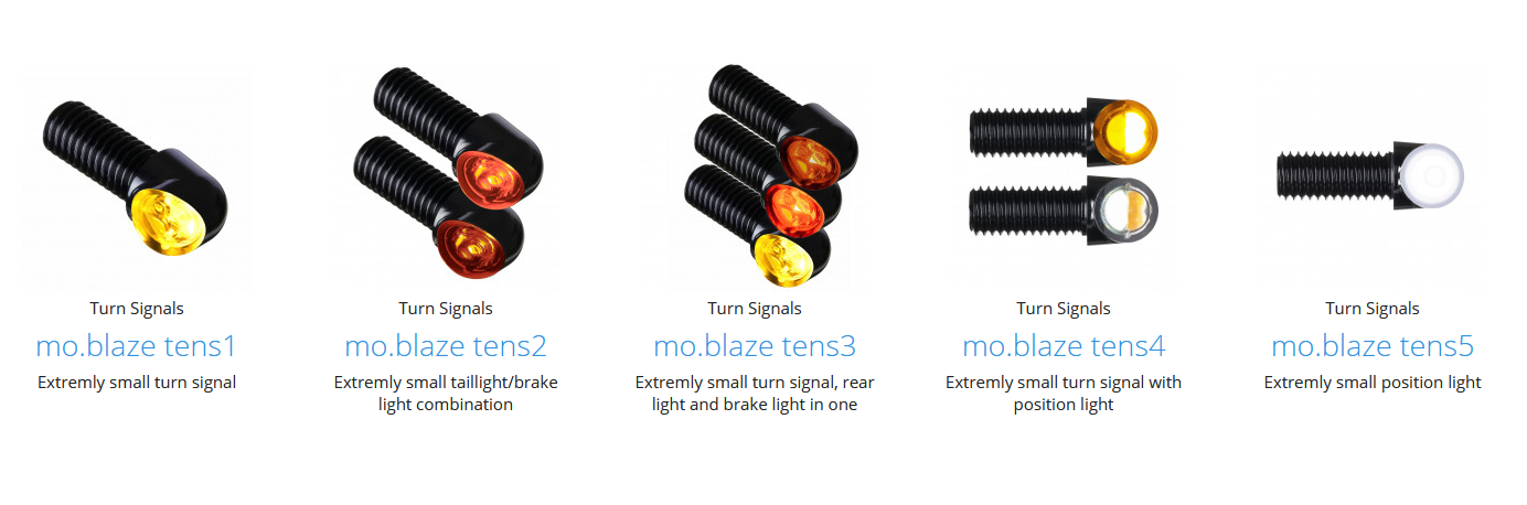 Mo.blaze tens3 od motogadget to najmniejszy kierunkowskaz 3w1 na świecie. Jest to kierunkowskaz, tylne światło i światło hamowania w jednym elemencie świetlnym. Jego niewielkie wymiary i zredukowana konstrukcja sprawiają, że prawie znika z pojazdu. Gdy tylko się zaświeci, jest niezwykle jasny dzięki technologii IntensiLED® i na pewno nie można go już przeoczyć. Jednocześnie dodatkowy boczny kąt wiązki zapewnia najlepszą widoczność i bezpieczeństwo. Element świetlny posiada homologację ECE jako tylny kierunkowskaz/światło tylne/światło hamowania. Aluminiowa obudowa jest obrabiana maszynowo CNC i dostępna w wykończeniu anodowanym na czarno lub polerowanym na wysoki połysk. Migacz może być obsługiwany jak każdy zwykły migacz LED z rezystorami obciążenia lub naszymi niezależnymi od obciążenia przekaźnikami migaczy (mo.flash, mo.wave, mo.stop, mo.relay+). Dopasowując mo.blaze tens3 oferujemy mo.blaze tens4 jako kierunkowskaz ze światłem pozycyjnym z przodu.