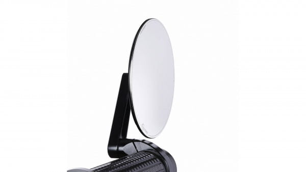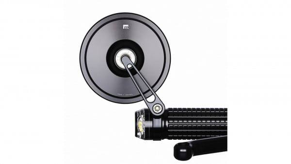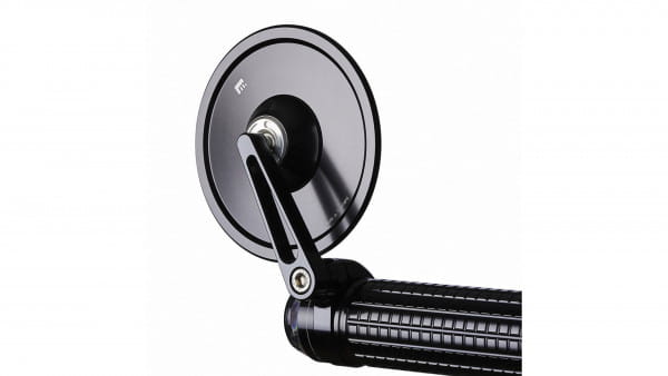 ECE approved; handlebar end mirror; aluminium; Round, 96mm diameter; Stem length 60mm. Motogadget mo.view mirrors are glassless. CNC machined from aluminum and finish-anodized, but a regular glass lens is not used. Instead the patented mirror surface is convex cut directly from the aluminum. This is done with ultra-precision diamond tools using a special ´flycutting´ procedure after which it is made corrosion and scratch resistant by a special vacuum plasma coating process. Available in regular and handlebar-end mirrors. Left & right side compatible, except where noted, allows above or below bar end installation and mounts directly onto or into 22mm or 1" diameter handlebars. Body thickness approx. 4.2mm without ball head. Note: Installation compatible with Motogadget bar end turn signals, the mo.grip and the push button controls mo.switch and mo.switch mini.