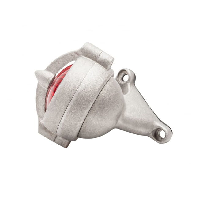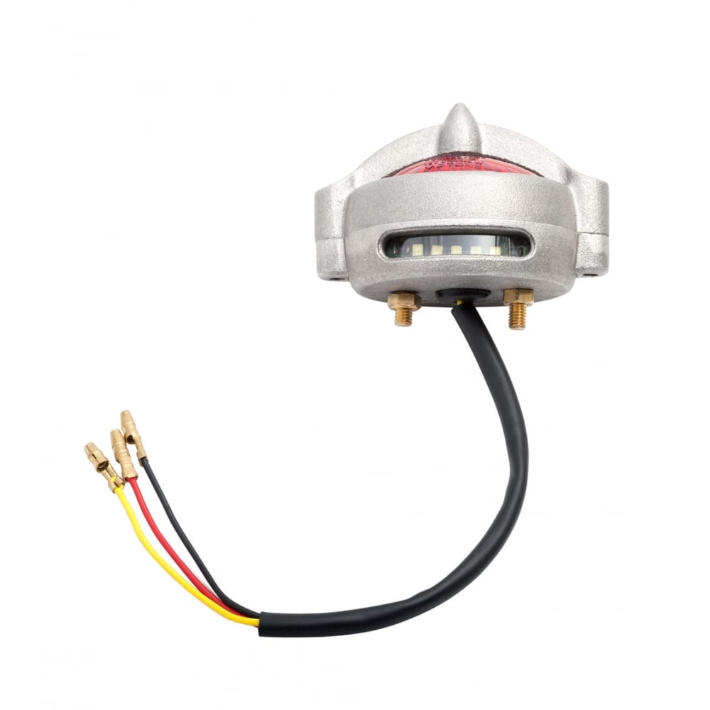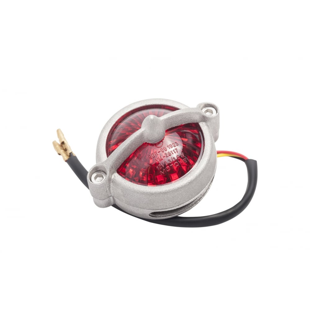 Shot blast finish. Taillight only, without fender mount bracket. ECE approved. Manufactured from die-cast aluminum but complete with modern and much more vibration-proof LED lighting. License plate illumination is done through a slot in the under side of the taillight body.