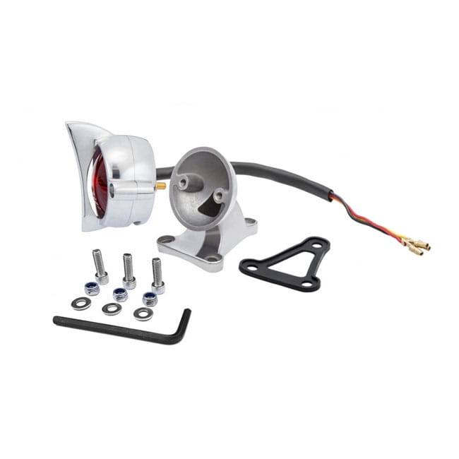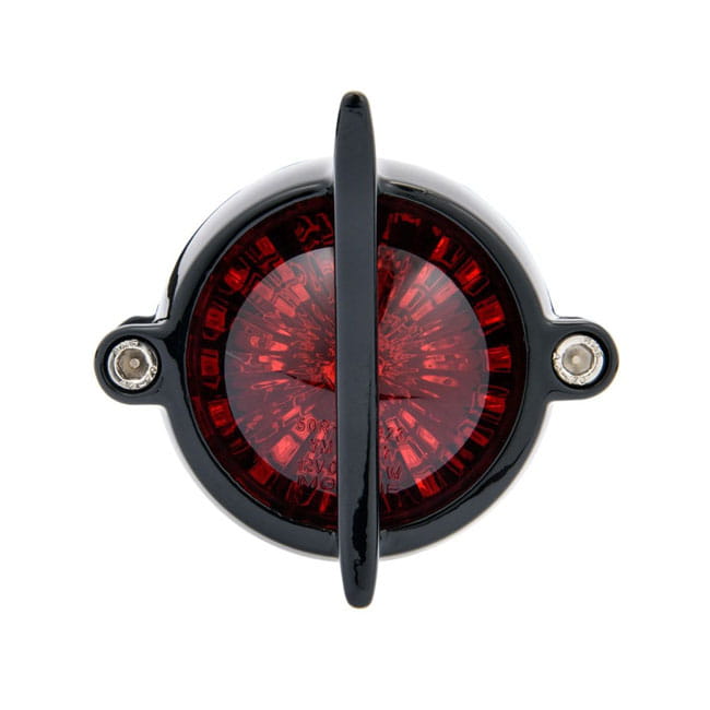 Black. ECE approved. Manufactured from die-cast aluminum but complete with modern and much more vibration-proof LED lighting. License plate illumination is done through a slot in the under side of the taillight body. Includes a style matching mounting bracket with matching rubber mount gasket for 'on fender' use and all required hardware.
