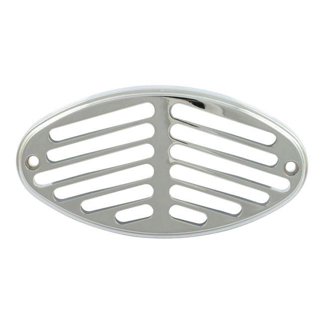 Chrome plated steel taillight grill for regular cateye style taillights.