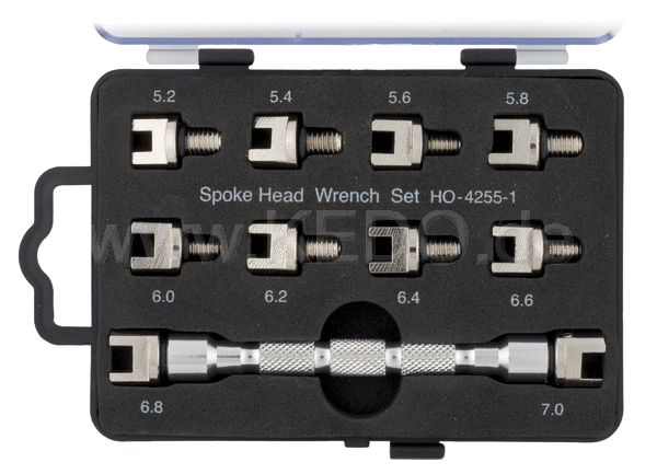 Zestaw narzędzi do regulacji szprych. Wygodny, radełkowany uchwyt, 10 rozmiarów końcówek w solidnej walizce.