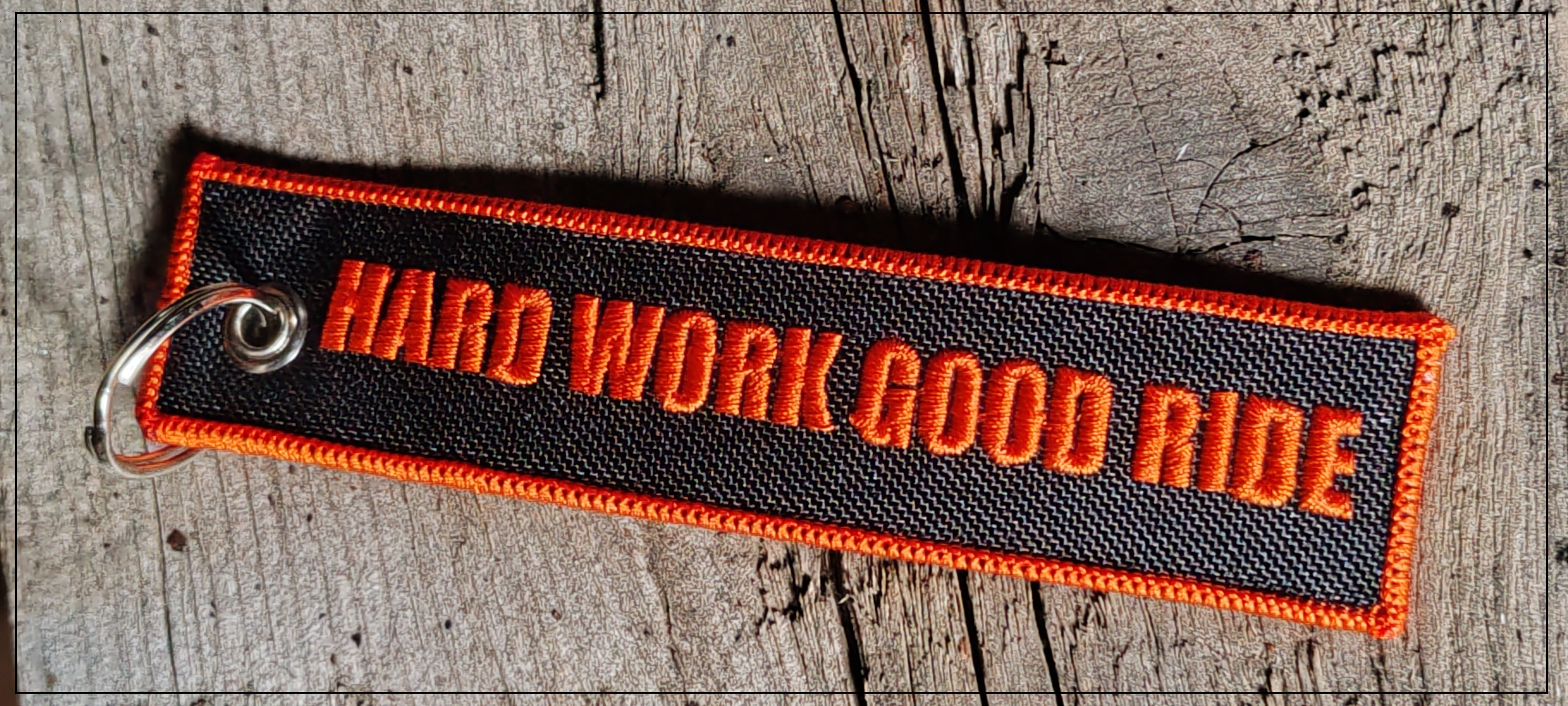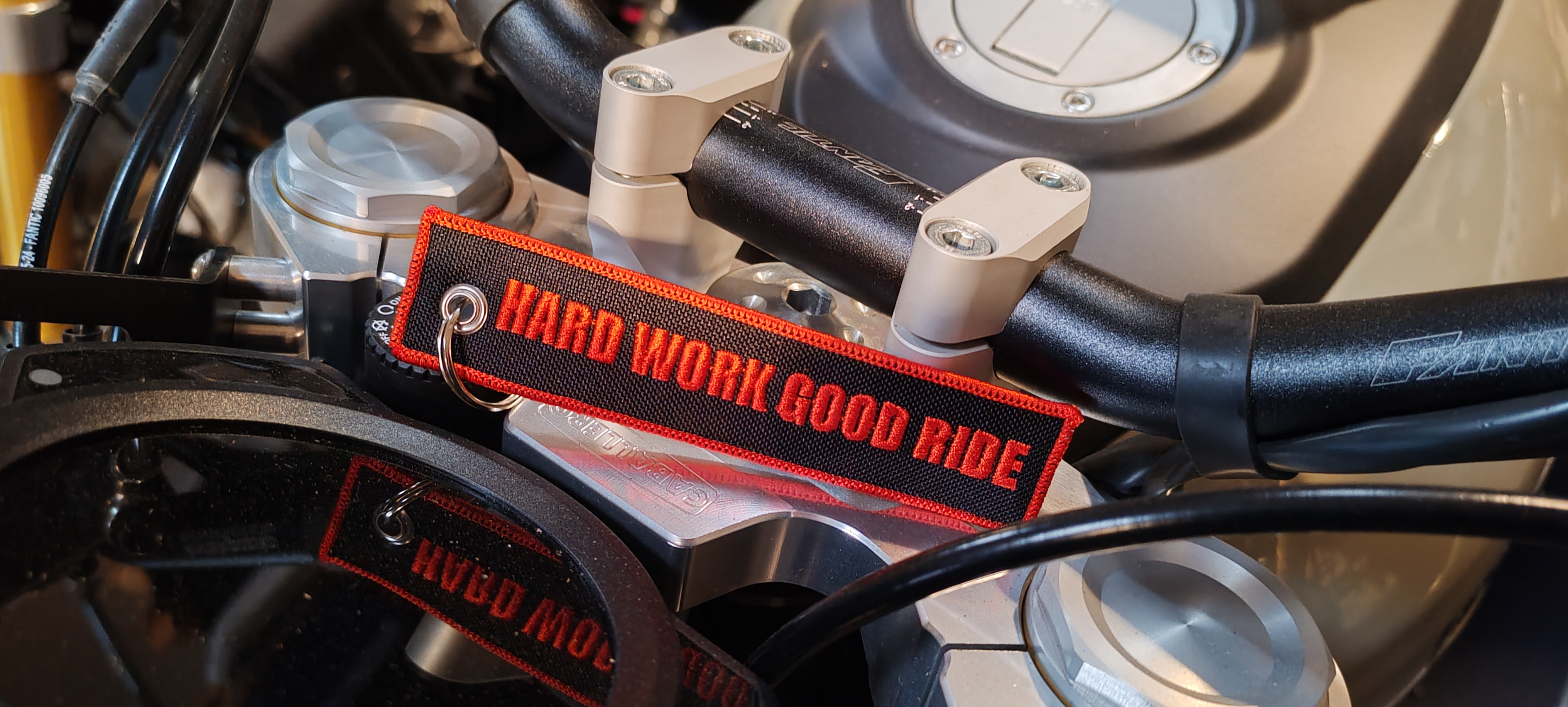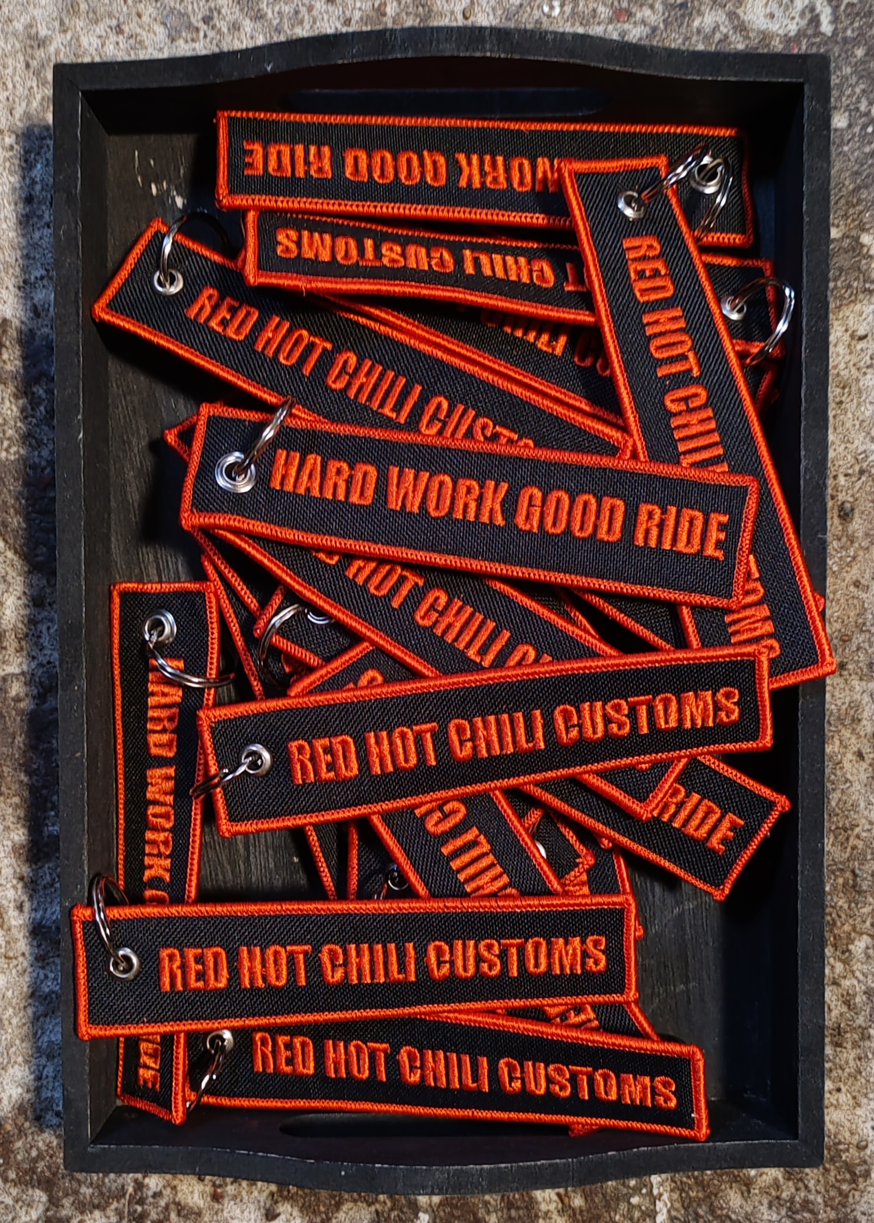Mały,zgrabny brelok w tematyce motocyklowej. Z przodu widnieje wyhaftowany napis "HARD WORK GOOD RIDE" zaś z drugiej nazwa naszej formy RED HOT CHILI CUSTOMS. Brelok wykonany jest z materiału, także podczas podróży nie porysuje Twojego motocykla. Idealny ma prezent.