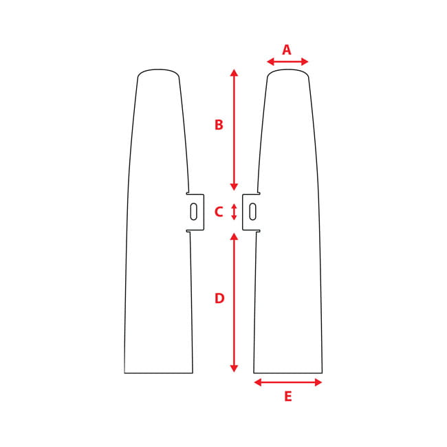 Fits 39mm forks. Cover sets for the exposed piece of fork tube at the triple trees. Gives a tough, massive look to the Sporty. Approx. dimensions: A=4.6cm, B=18.2cm, C=3.7cm, D=14.3cm, E=6.7cm. Overall length 36,5cm. Note: Not compatible with front fenders.