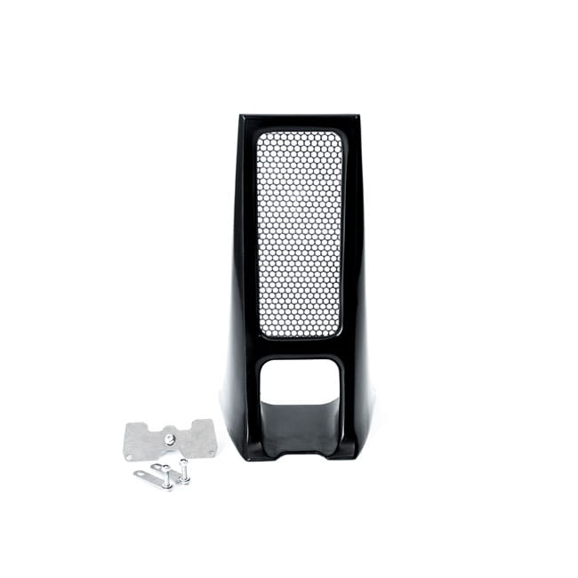 Covers the stock radiator, improving the radiator look from average to badass. Does not interfere with cooling of radiator or voltage regulator like some others tend to do. Made of hand-laid unpainted gel coated fiberglass that is very stiff, strong, straight and light with a backing of black powder coated 'honeycomb' wire mesh. Includes all required hardware.