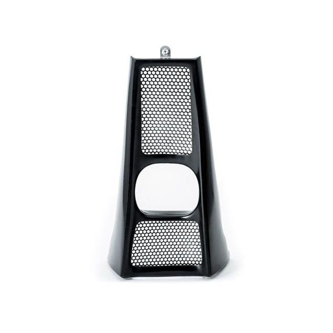 Covers the stock radiator, improving the radiator look from average to badass. Works with all 16 to 30 inch wheels with or without rake. Does not interfere with cooling of radiator or voltage regulator like some others tend to do. Made of hand-laid unpainted gel coated fiberglass that is very stiff, strong, straight and light with a backing of black powder coated 'honeycomb' wire mesh. Includes required hardware.