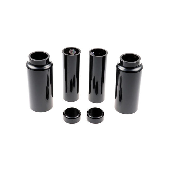 Gloss black powder coated CNC machined aluminum covers. Covers the full front fork from bottom to top of the upper triple tree. Includes aluminum fork tube caps, upper fork covers and smooth black aluminum lower fork covers. Transforms the complete front end to a massive Black-Out muscle bike look. Compatible with stock and custom fenders. Installs with set-screws. All required hardware is included.