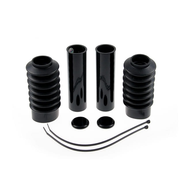 Gloss black powder coated CNC machined aluminum covers. Covers the full front fork from bottom to top of the upper triple tree. Includes aluminum fork tube caps, upper fork covers and genuine black rubber (bobber boots) lower fork covers for a touch of retro. Transforms the complete front end to a massive Black-Out muscle bike look. Compatible with stock and custom fenders. Installs with set-screws. All required hardware is included.