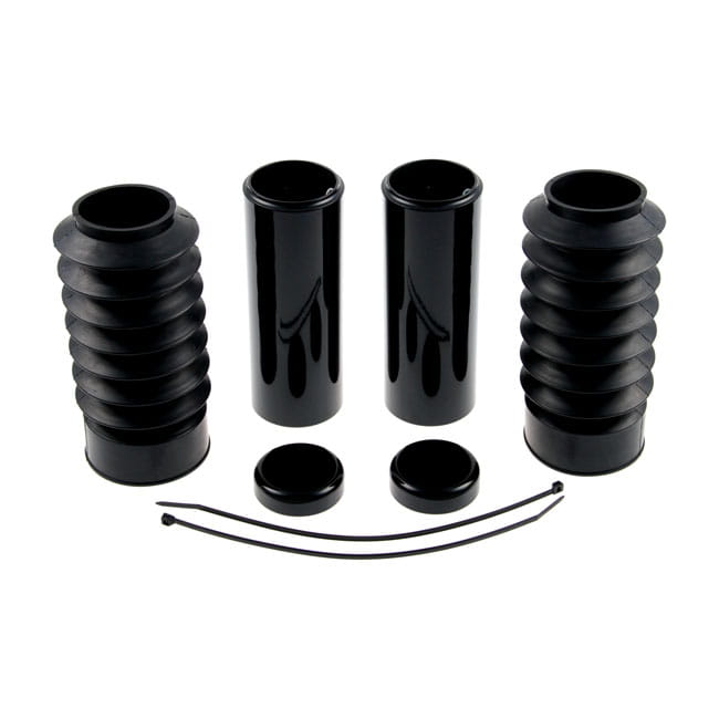 Gloss black powder coated CNC machined aluminum covers. Covers the full front fork from bottom to top of the upper triple tree. Includes aluminum fork tube caps, upper fork covers and genuine black rubber (bobber boots) lower fork covers for a touch of retro. Transforms the complete front end to a massive Black-Out muscle bike look. Compatible with stock and custom fenders. Installs with set-screws. All required hardware is included.