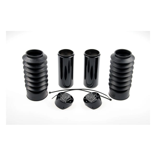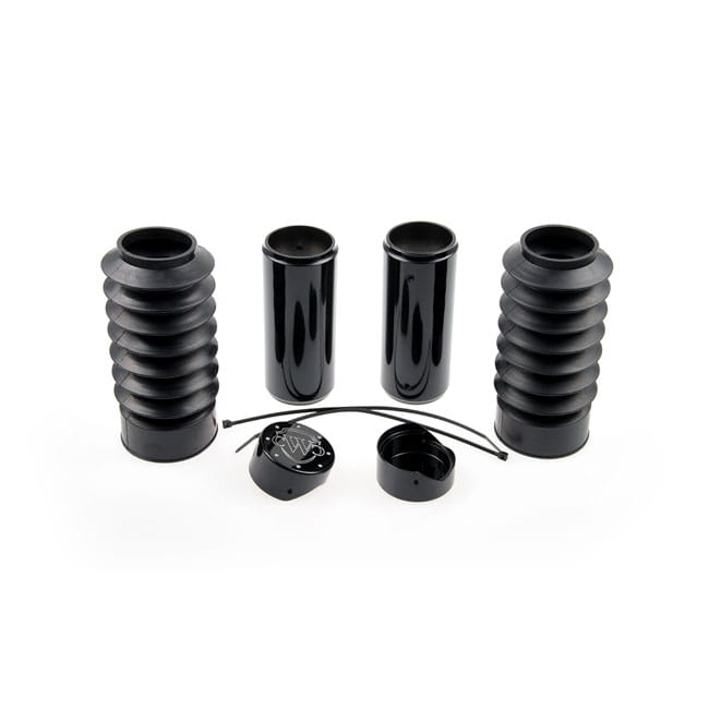 With contrast cut machined Cult-Werk logo on the fork tube caps. With rubber fork boots and gloss black powder coated CNC machined aluminum upper covers. Covers the full front fork from bottom to top of the upper triple tree. Includes aluminum fork tube caps, upper fork covers and genuine black rubber (bobber boots) lower fork covers for a touch of retro. Transforms the complete front end to a massive Black-Out muscle bike look. Compatible with stock and custom fenders. Installs with set-screws. All required hardware is included.