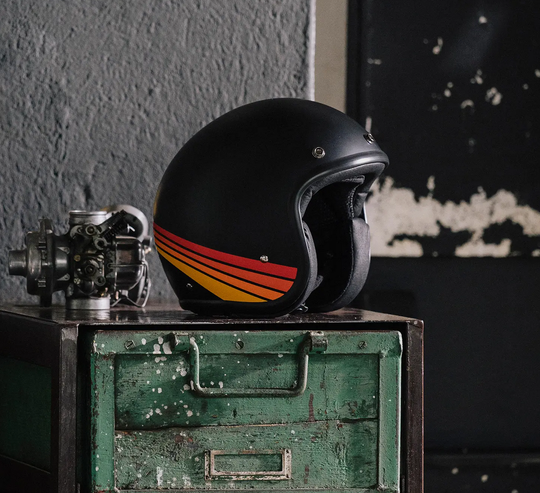 Kask jet Retro Fuoco, matowa czerń z prostym wzorem dekoracyjnym w odcieniach czerwieni i pomarańczy, to idealny produkt dla motocyklisty, który kocha styl lat 70., ale także dla użytkowników skuterów, którzy szukają wygodnego, małego, bezpiecznego i oryginalnego kasku.