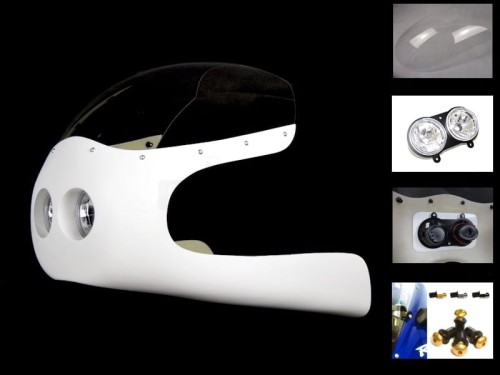 Owiewki do indywidualnej aranżacji na motocyklu, wykonanie uchwytów we własnym zakresie. Bazą jest żywica GFK oraz maty najwyższej jakości. Zewnętrzna warstwa żelkotu jest odporna na promieniowanie UV i może być dowolnie obrabiana do lakierowania. W miejscach narażonych na naprężenia dodatkowo wzmocnione warstwą kewlaru.