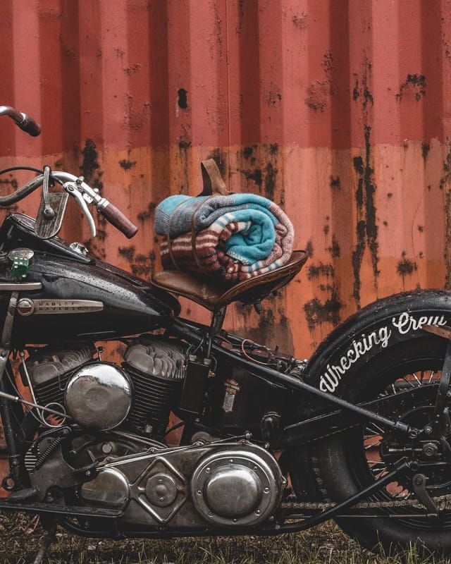 Pike Brothers 1969 Tolani wool blanket teal wełniany koc motocyklowy ze skórzanymi mocowaniami chopper harley klasyczne motocykle niebieski koc