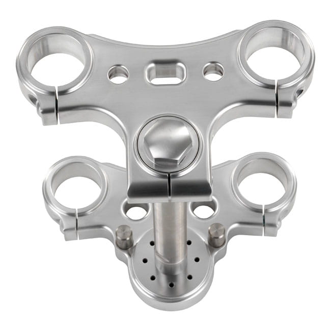 With hole for risers. Kustom-Tech's billet CNC machined triple trees, for 39mm fork tubes, are super narrow. With just 146mm (5 3/4") center to center fork tubes they are 1 1/4" (31.75mm) narrower than stock Narrow Glide triple trees. Riser holes are 2 1/2" center to center, 1" closer together than stock. Comes complete with 1" diameter steering stem, bearings and external forks tops. Note 1: Make sure you will be able to mount the front wheel & brake set-up of your choice. Note 2: Trees come with external fork stops. Internal forks tops can be ordered separately, if required Note 3: Ribbed fork tube caps can be ordered separately and used with the 'No Hole' triple trees. They come with M34 x 1.5 thread. Handlebars can be welded to the fork tube caps and give an ultra clean look.