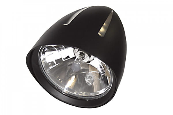 Halogenowy reflektor główny H4 z wysokiej jakości czarną obudową aluminiową z 3 efektownymi, frezowanymi CNC rowkami i nostalgicznym kloszem (długość: ok. 25 mm) w stylu retro.