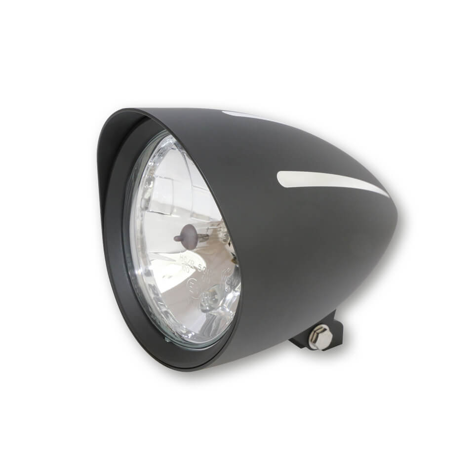 Headlight CLASSIC 1 EXTREME with shade and 3 CNC milled grooves, 5 3/4 inch H4 12V 60/55W, black aluminium housing, prism reflector with parking light, lower mounting, E-tested.