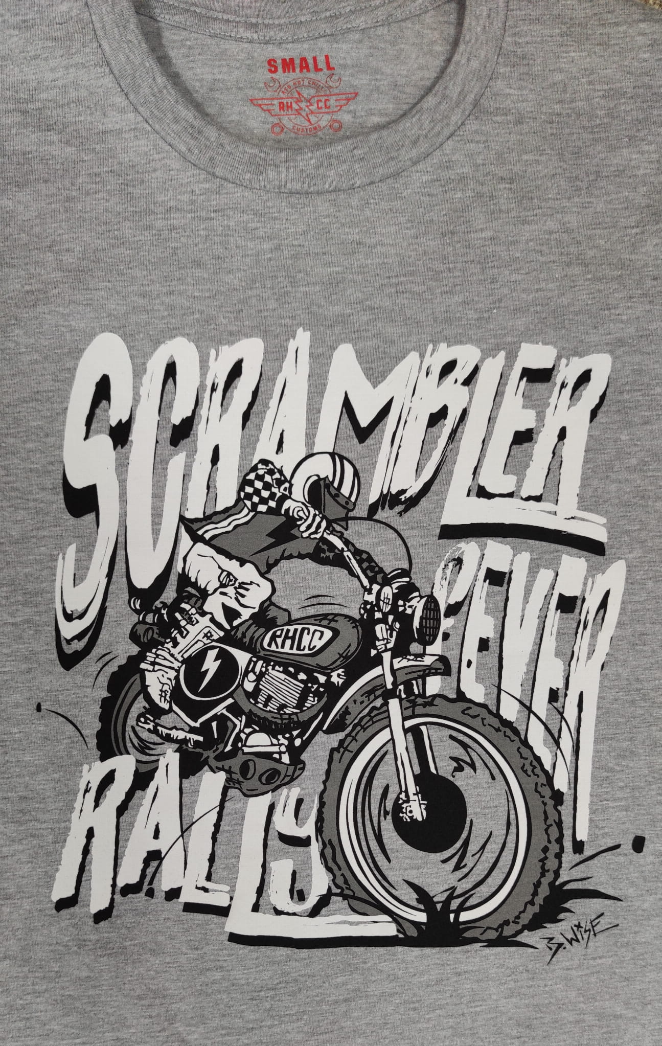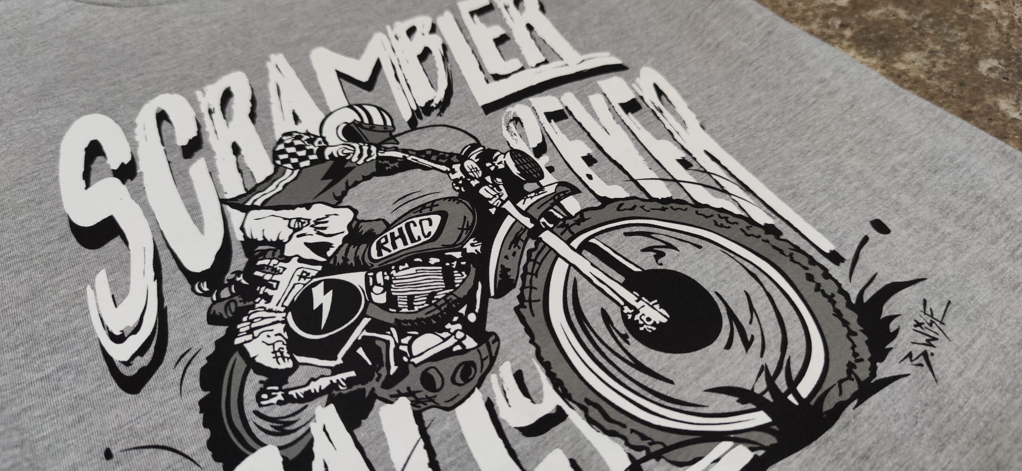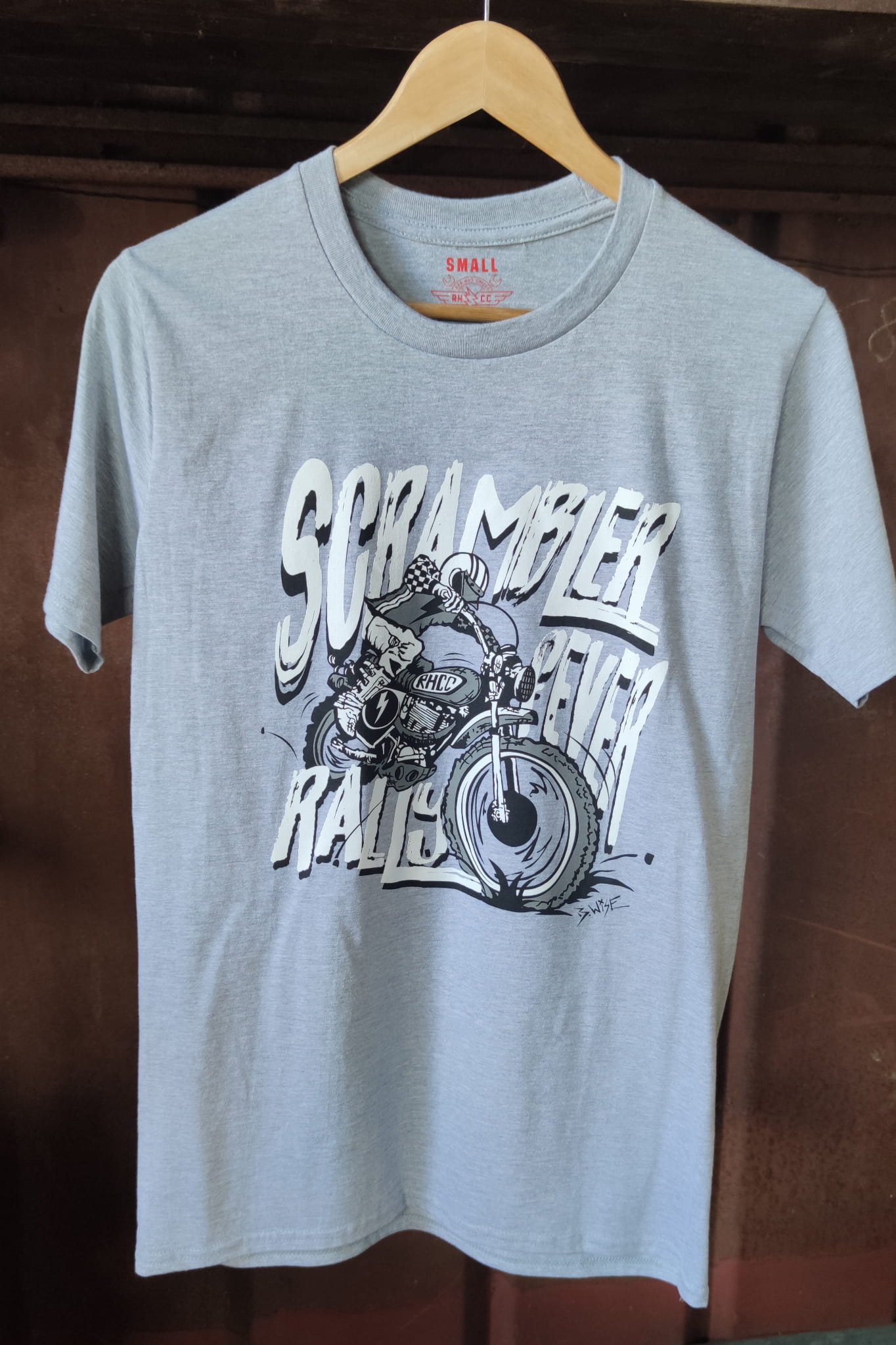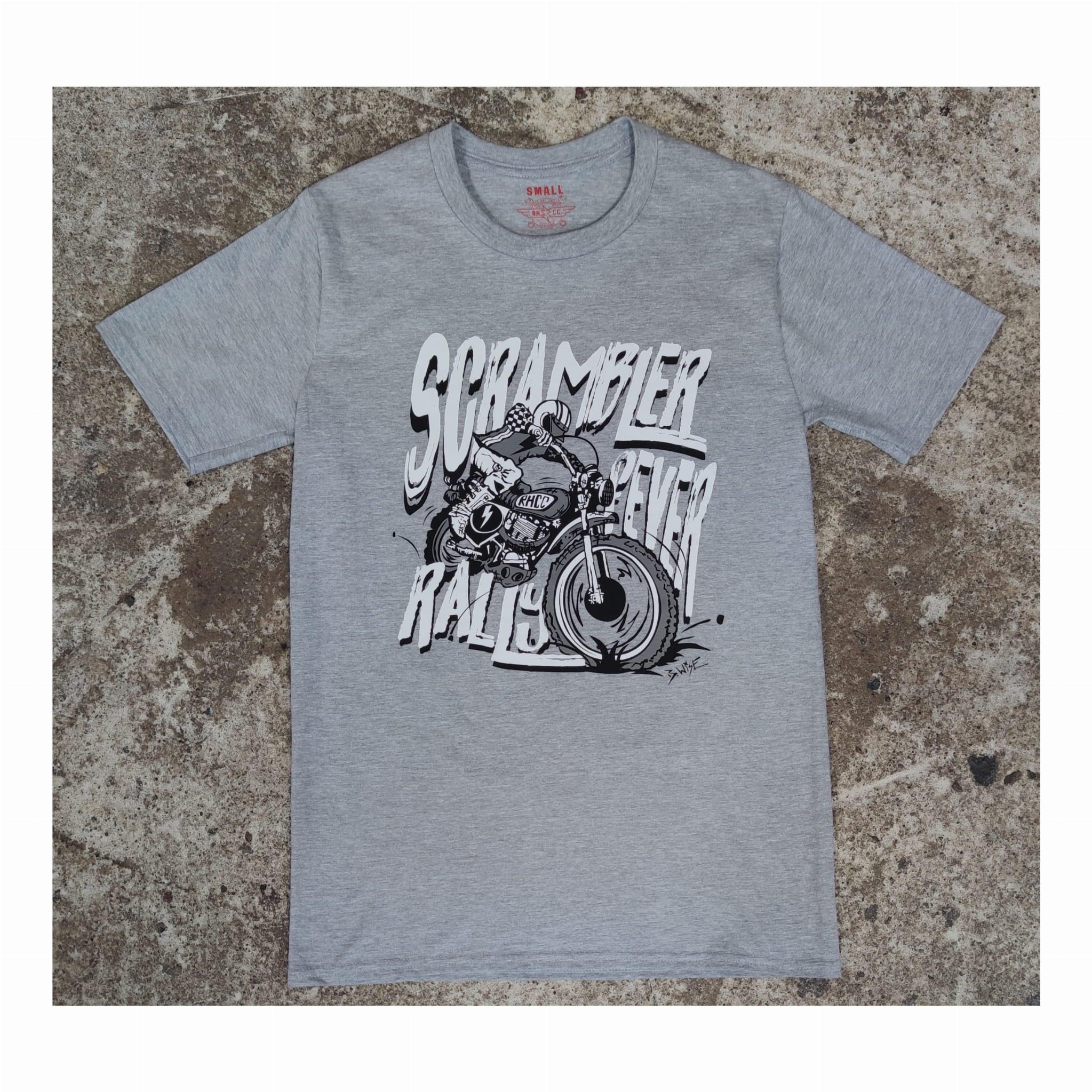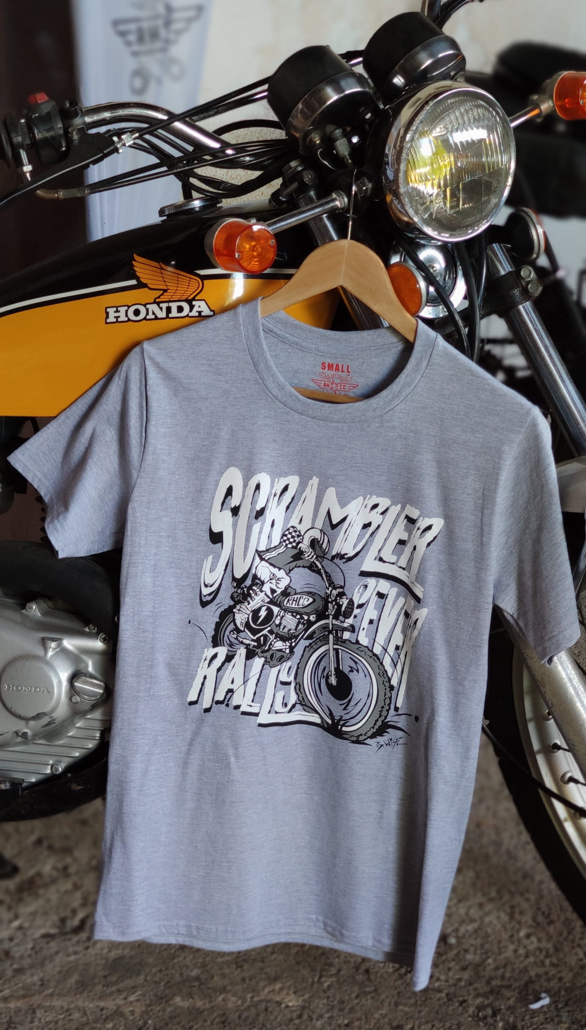 SCRAMBLER FEVER SZARA KOSZULKA MOTOCYKLOWA Z MOTOCYKLEM Z DUŻĄ GRAFIKĄ T-SHIRT PREMIUM