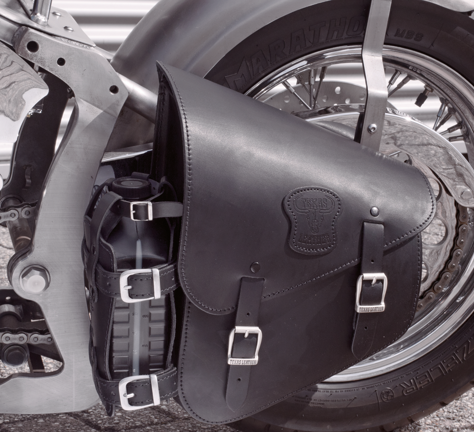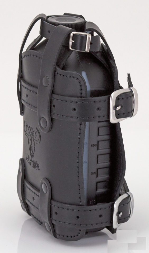 SKÓRZANY UCHWYT NA KANISTER 1,5 L DO MOTOCYKLA NA PODRÓŻ MOTOCYKLOWE CZARNE SKÓRZANE MOCOWANIE CHOPPER HARLEY BOBBER