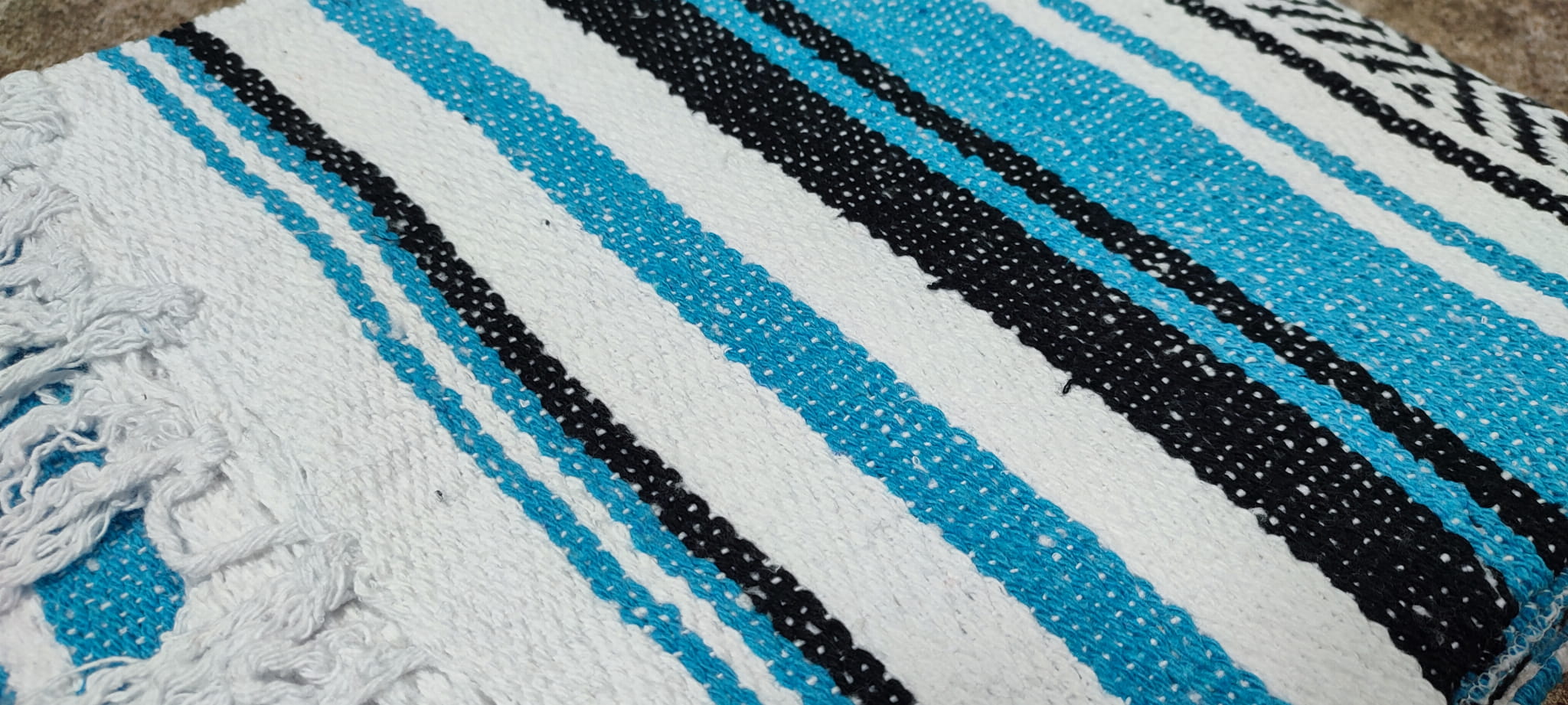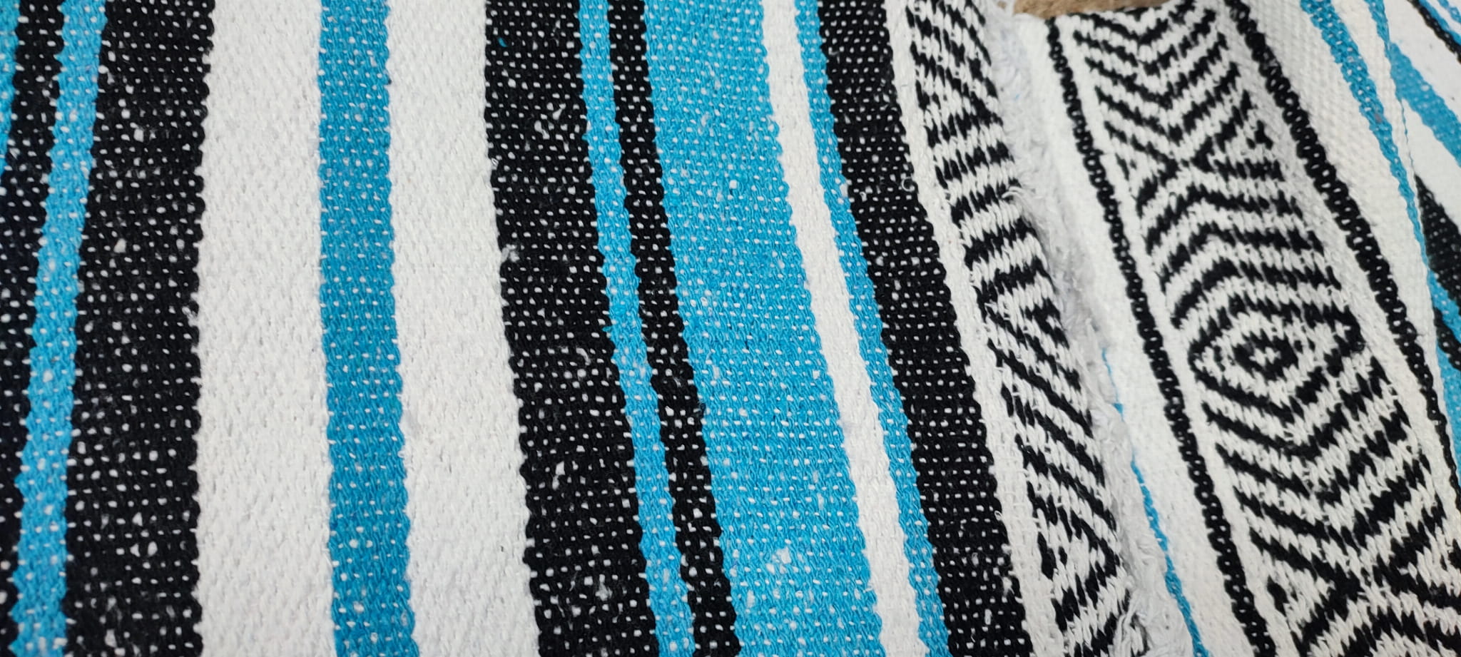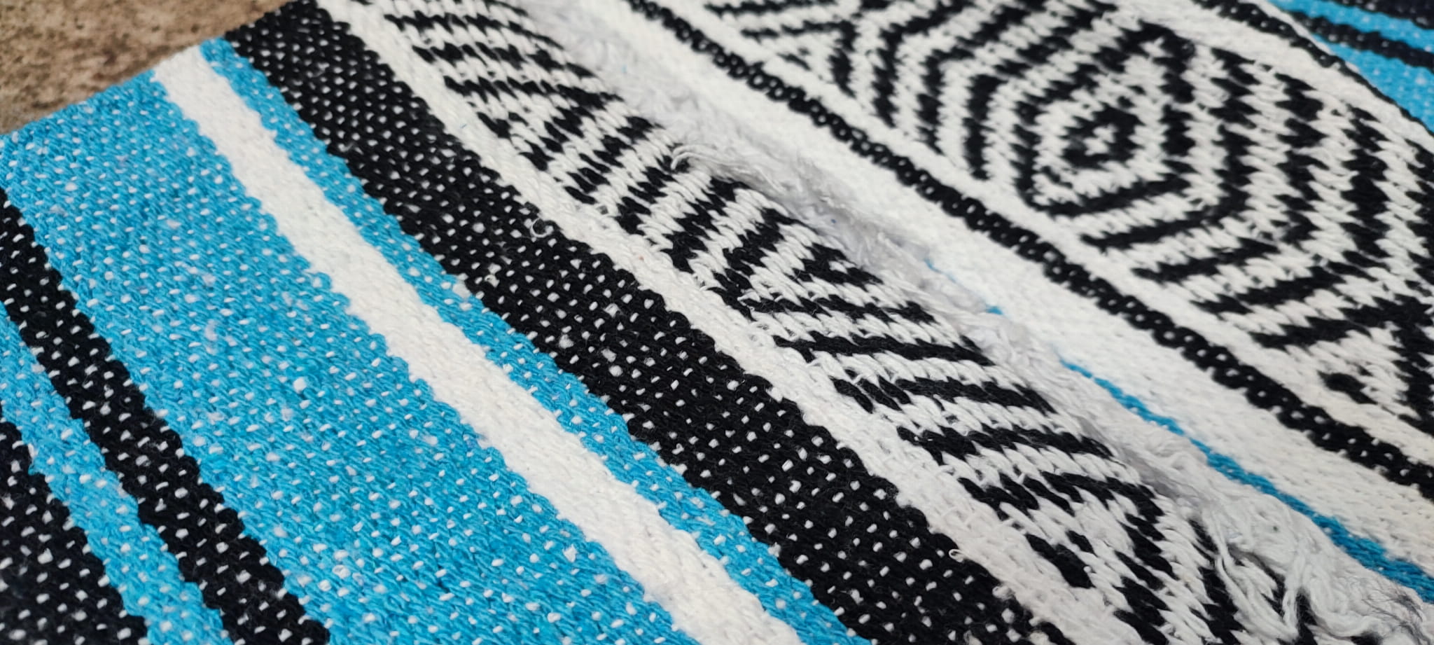 SZARO-TURKUSOWO-BIAŁY MEKSYKAŃSKI KOC MOTOCYKLOWY VERACRUZ CHOPPER BOBBER HARLEY KOC MEKSYKAŃSKI