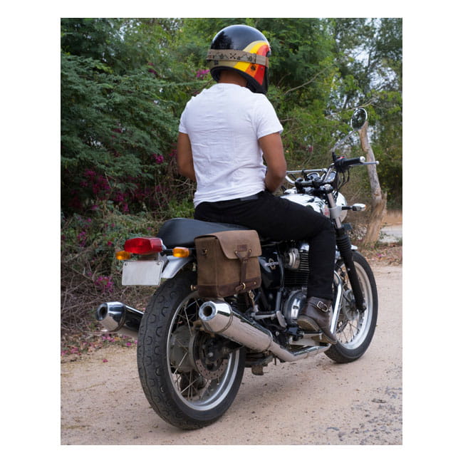 Skóra została poddana obróbce, aby nadać mu charakterystyczny, zniszczony wygląd, który z wiekiem będzie tylko coraz lepszy. Dzięki uniwersalnemu systemowi mocowania można go założyć/zdjąć z motocykla w ciągu kilku sekund i wygodnie nosić na ramieniu. Przestronna kieszeń wykonana z najwyższej jakości zamszu pozwala zachować porządek.