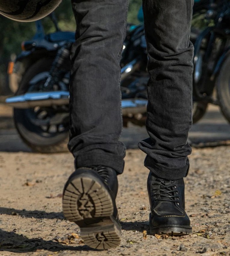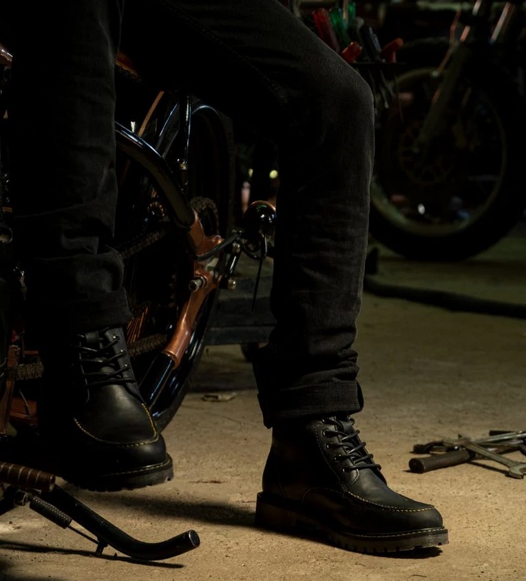 Zaprojektowane pierwotnie na początku XX wieku dla pracowników fabryk, buty posiadają charakterystyczny nosek w stylu mokasynów, który zapewnia dodatkową ochronę i trwałość w okolicy palców. Buty Trip Machine Moto Moc-Toe posiadają dodatkową, 1,8-milimetrową wkładkę w obszarze palców i pięty oraz ochraniacze kostek. Wykonane z wytrzymałej, odpornej na ścieranie skóry, buty chronią w razie niefortunnego poślizgu. Podeszwa wykonana jest na bazie żywicy, która została specjalnie zaprojektowana, aby zapewnić dodatkową przyczepność na drodze. Metalowy trzonek, wkładka z Texonu i wysokiej jakości wyściółka z lycry zapewniają stopom najwyższy komfort podczas długich dni. Buty Moc-Toe są stylizowane zarówno na jazdę, jak i poza nią. To idealne obuwie nawet w dni, gdy nie jeździsz na motocyklu. To ponadczasowe obuwie, które łączy styl i funkcjonalność.