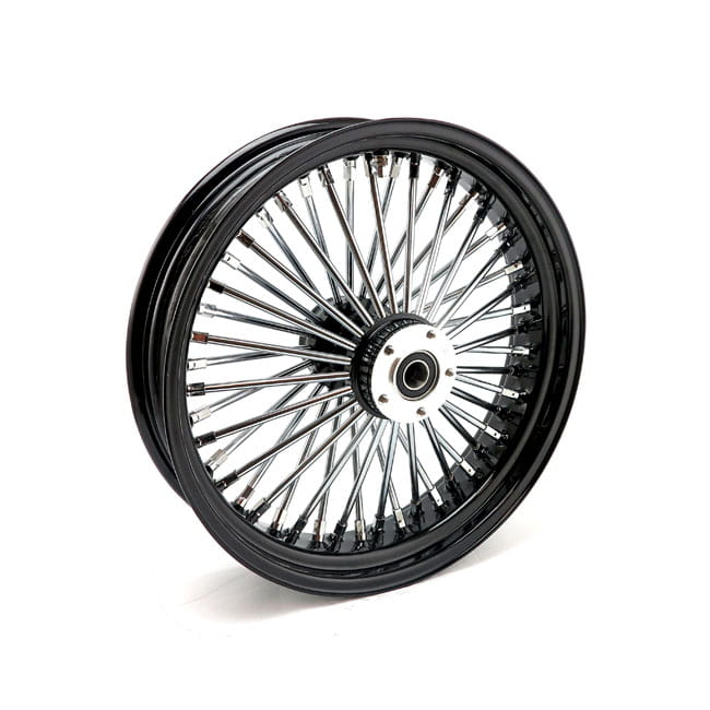Ready to run black powder coated wheel that is built with 48 chrome plated 8mm diameter steel spokes & nipples, a steel rim and an aluminum hub. Wheel is pre-sealed and suitable for tubeless tires. 1" ID roller bearings are pre-installed and the brake rotor/pulley flanges come in H-D style mount pattern with 56mm center. Rear wheel is 3/8-16 UNC threaded on the brake rotor side and 7/16-14 UNC threaded on the sprocket side. Total hub width 16cm.