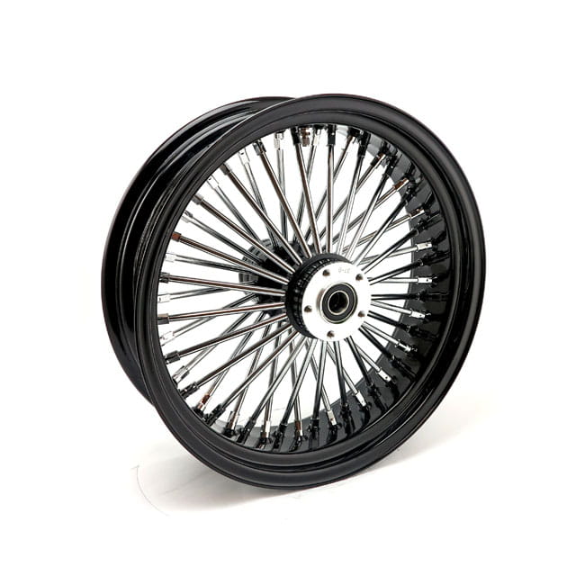 Ready to run black powder coated wheel that is built with 48 chrome plated 8mm diameter steel spokes & nipples, a steel rim and an aluminum hub. Wheel is pre-sealed and suitable for tubeless tires. 1" ID roller bearings are pre-installed and the brake rotor/pulley flanges come in H-D style mount pattern with 56mm center. Rear wheel is 3/8-16 UNC threaded on the brake rotor side and 7/16-14 UNC threaded on the sprocket side. Total hub width 16cm.