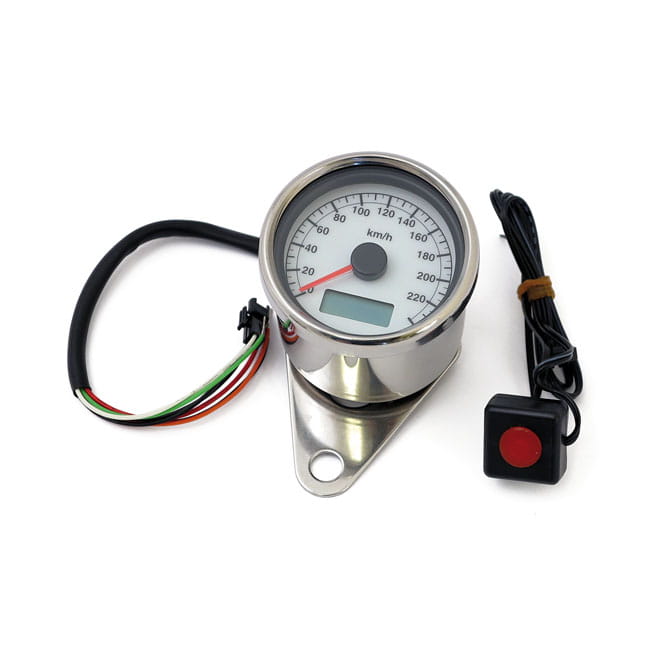 - Biała tarcza 240 km/h ze stalową obudową i podświetleniem LED.