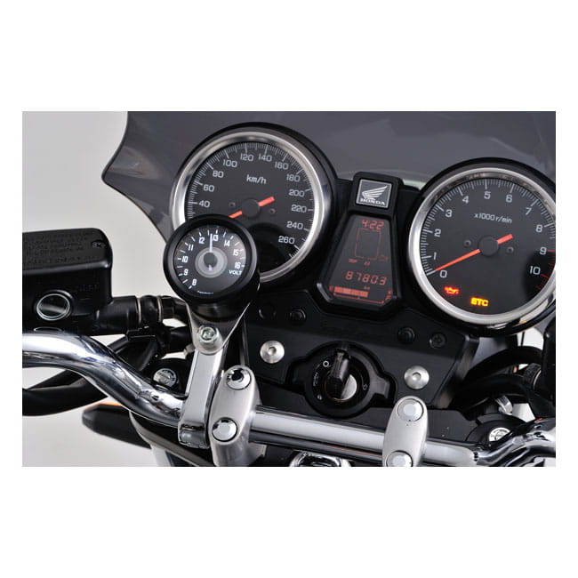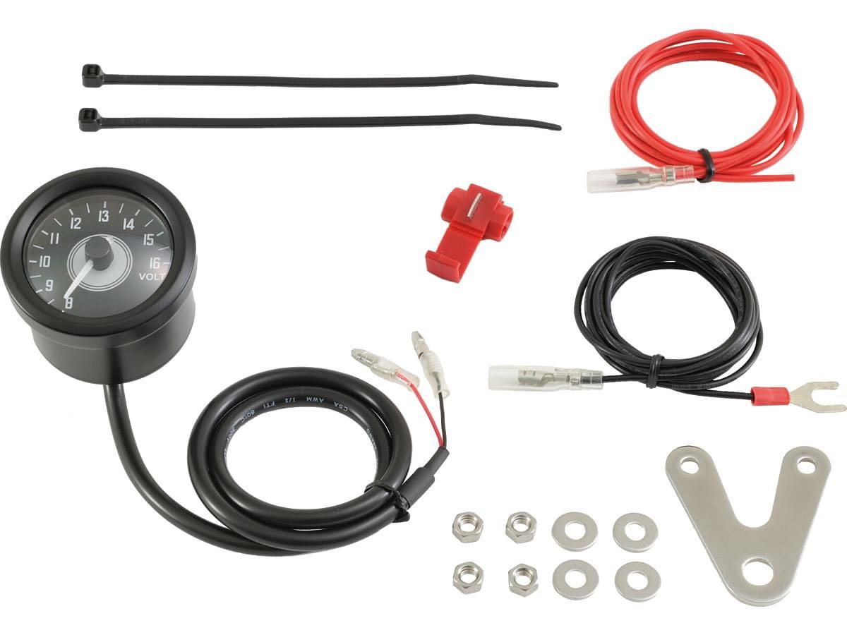 Universal 48mm analog voltmeter with stainless body. White backlit lighting with a red LED low voltage warning light. Includes V shaped bracket. 8.0~16.0V. - Stepper motor with precise volt display - Voltage range: 8.0 - 16.0V - Background LED color: white - Battery warning: Low voltage alert by Red LED backlight when less than 12V - Stainless steel housing - Incl. V-shaped mounting bracket.