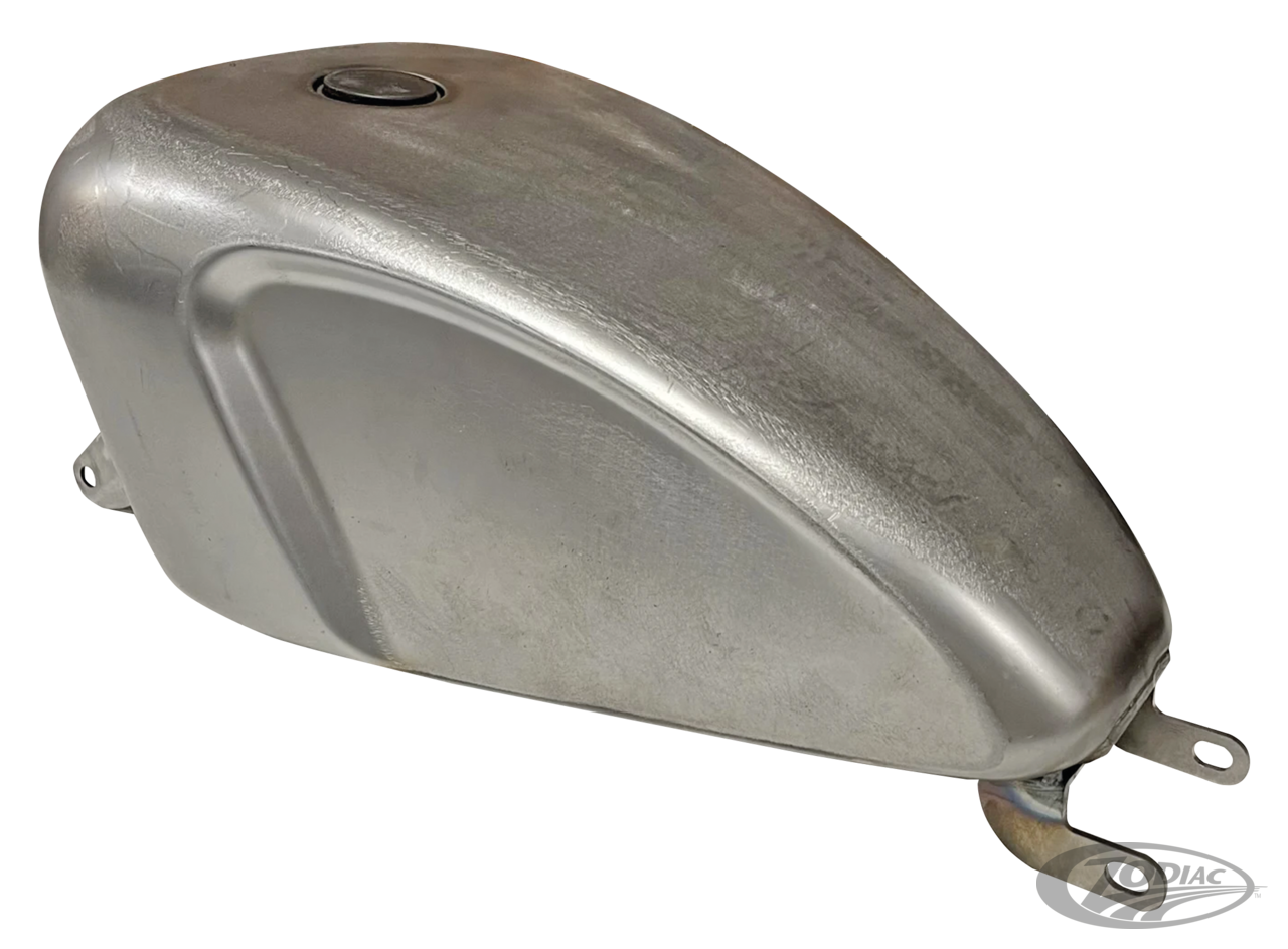 The zinc-chromate primer finish on some of our tanks is provided for the protection of the tanks during shipment and storage. It is not recommended as a primer finish for paint applications without proper surface preparation. As with any fuel tank, particularly one where custom paint is to be applied, all tanks must be pressure tested, then cleaned with tank cleaner and sealed with tank sealer before painting, to protect the final finish and prevent internal rust during winter storage. Fuel capacity is measured with tank in upright position, angle of parked bike will determine actual capacity of the fuel tank.
