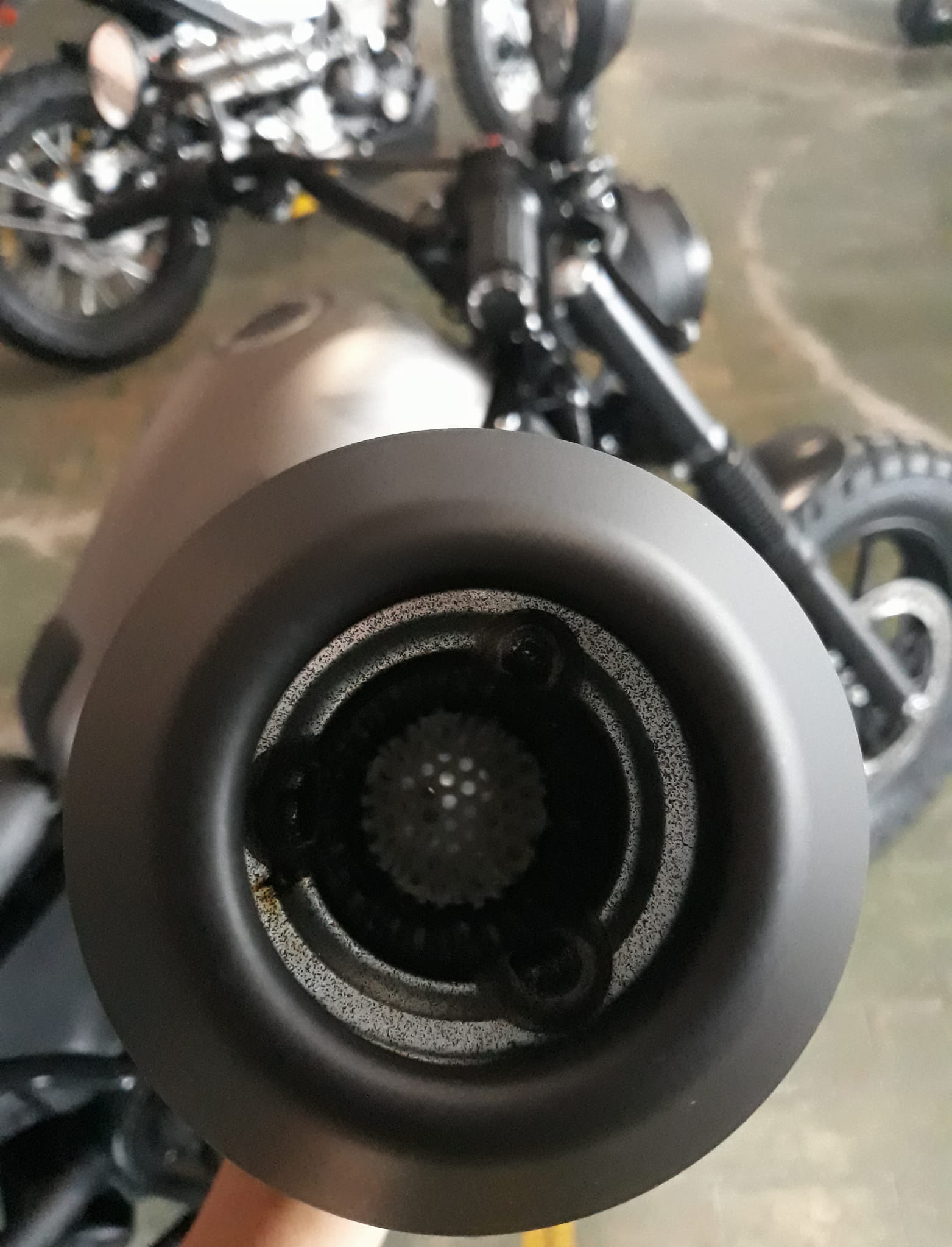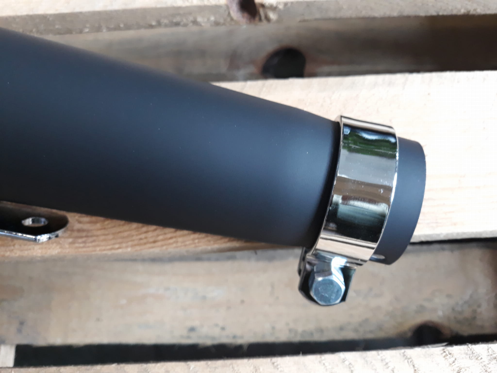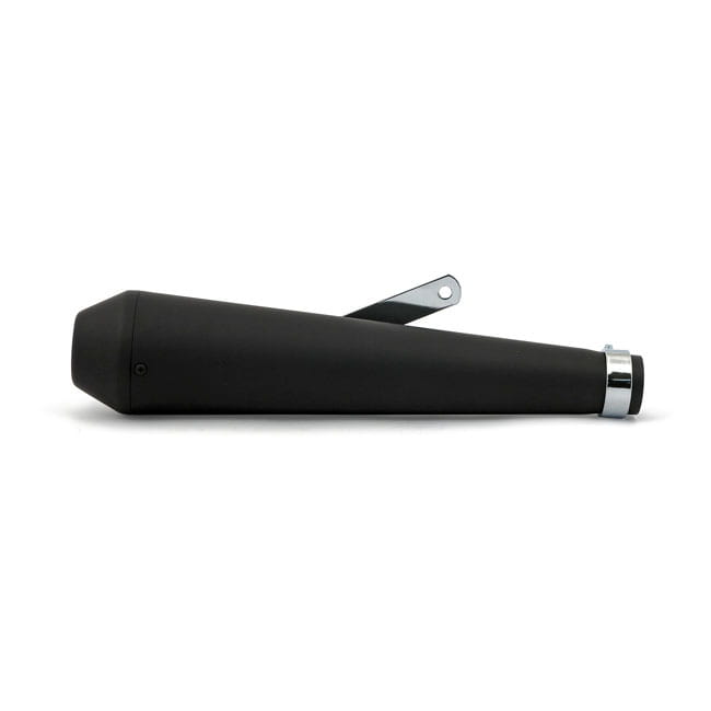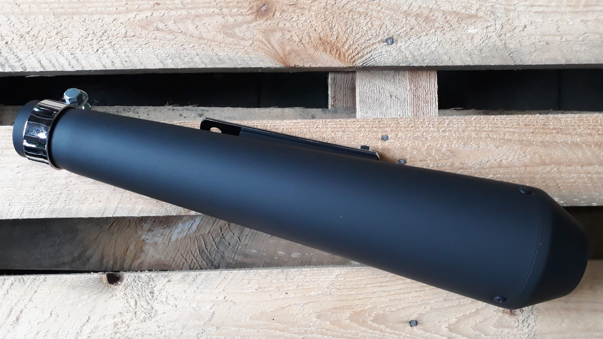 Tłumik uniwersalny czarny z odkręcaną końcówką. Idealny w motocyklach typu cafe racer, street tracker, bobber. Długość ok 43,2 cm, średnica w najszerszym miejscu ok 9,6 cm, Średnice wejściowe: 1 1/2", 1 5/8", 1 3/4" ( 38,1mm, 41,3mm, 44,5mm) dzięki załączonym w komplecie redukcjom.